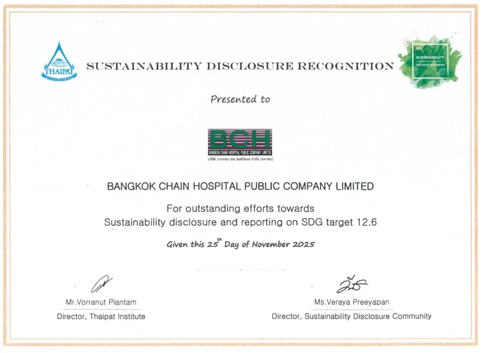 25 พฤศจิกายน 2568 – คุณพรสุดา หาญพาณิชย์, C.P.S. รองกรรมการผู้จัดการฝ่ายการเงิน บริษัท บางกอก เชน ฮอสปิทอล จำกัด (มหาชน) หรือ BCH เป็นผู้แทนองค์กรเข้ารับ “ประกาศเกียรติคุณด้านการเปิดเผยข้อมูลความยั่งยืน (Sustainability Disclosure Recognition)” จากสถาบันไทยพัฒน์ จากผลการประเมินการเปิดเผยข้อมูลของหลักทรัพย์จดทะเบียนประจำปี 2568 ซึ่งจัดขึ้นภายใต้โครงการประชาคมการเปิดเผยข้อมูลความยั่งยืน (Sustainability Disclosure Community: SDC) เพื่อเชิดชูองค์กรที่ให้ความสำคัญกับการเปิดเผยข้อมูลด้านความยั่งยืนต่อสาธารณะ